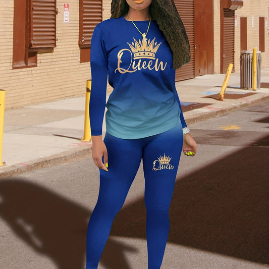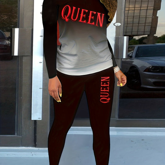 Queen Letter Print Two-piece Set, Crew Neck Long Sleeve Tops & Slim Pants Outfits, Women's Clothing