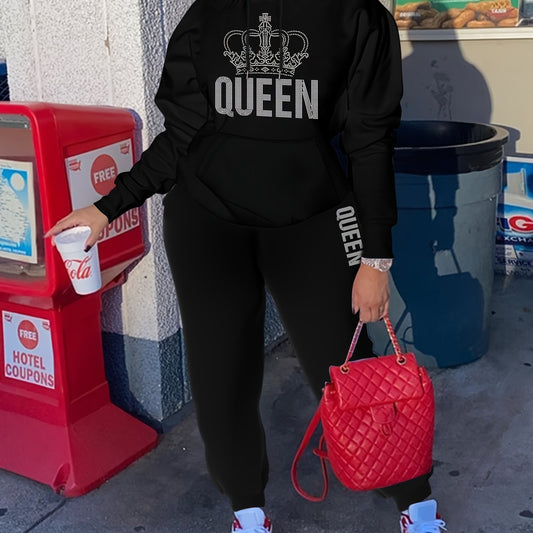 Queen Print Two-piece Set, Casual Long Sleeve Drawstring Hoodie & Jogger Sweatpants Outfits, Women's Clothing