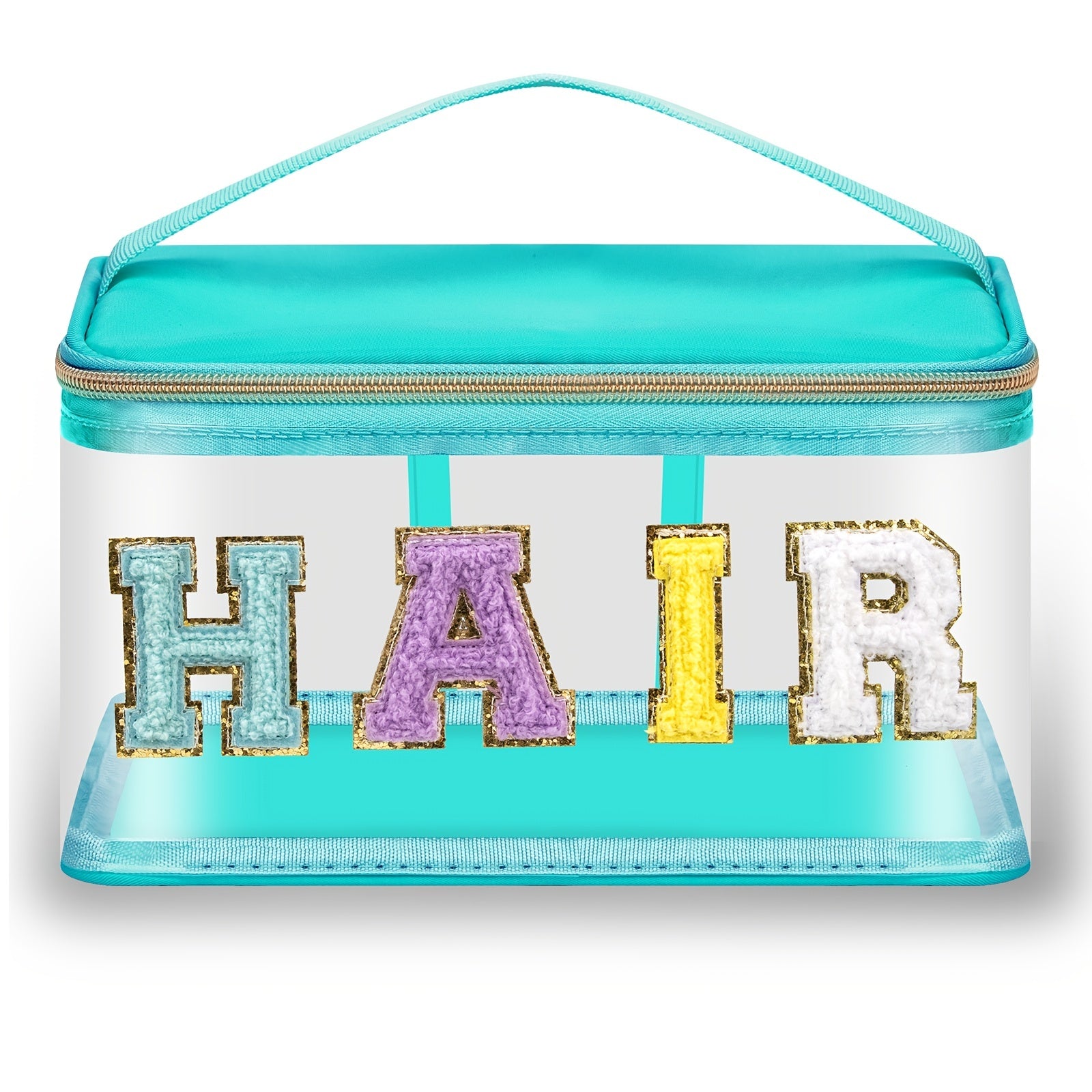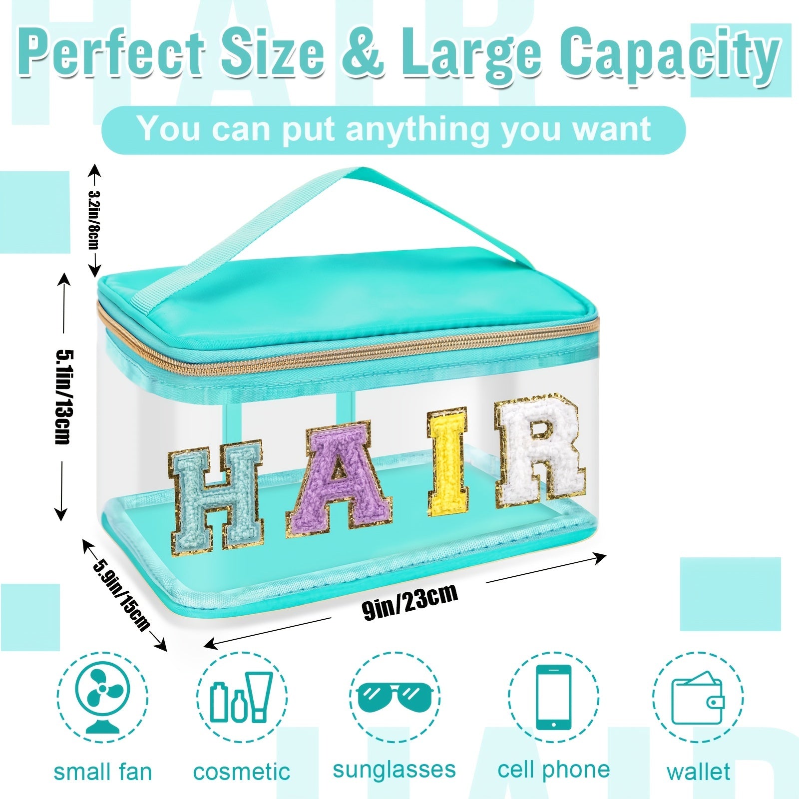 Chenille Letter Clear Makeup Bags Hair Pouch, Preppy Patch Makeup Bag Zipper With Handle, Transparent PVC & Nylon Waterproof Glitter Cosmetic Handbag Travel Toiletry Storage Bag Valentine's Day Birthday Gift For Girls Women (HAIR-Green)