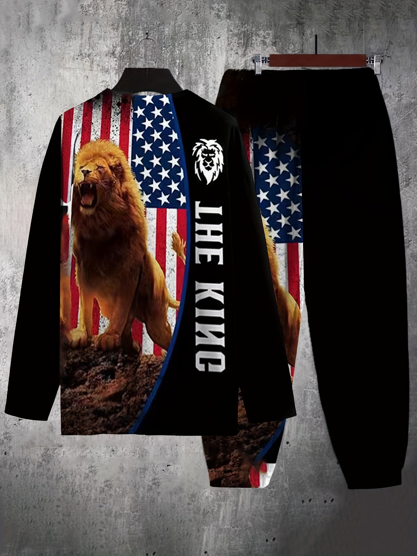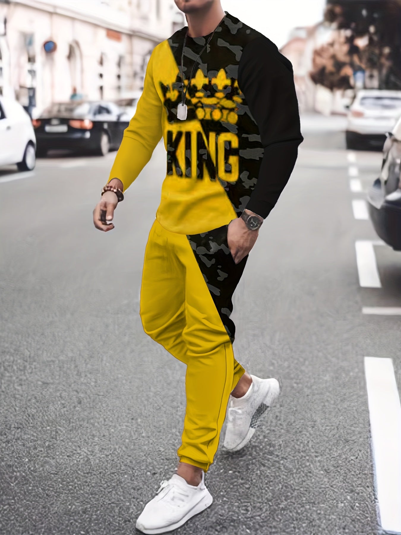 KING Crown Print, Men's Color Block 2pcs, Casual Loose Comfy Sweatshirt And Drawstring Waist Sweatpants Set
