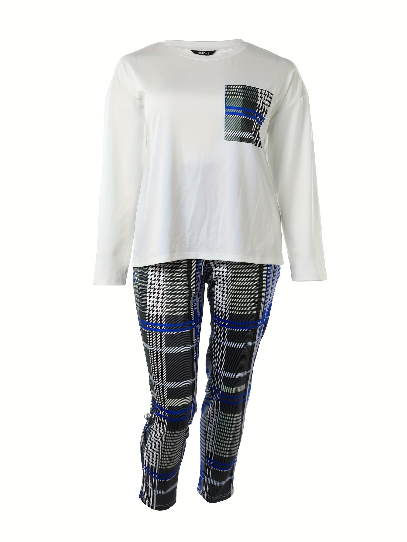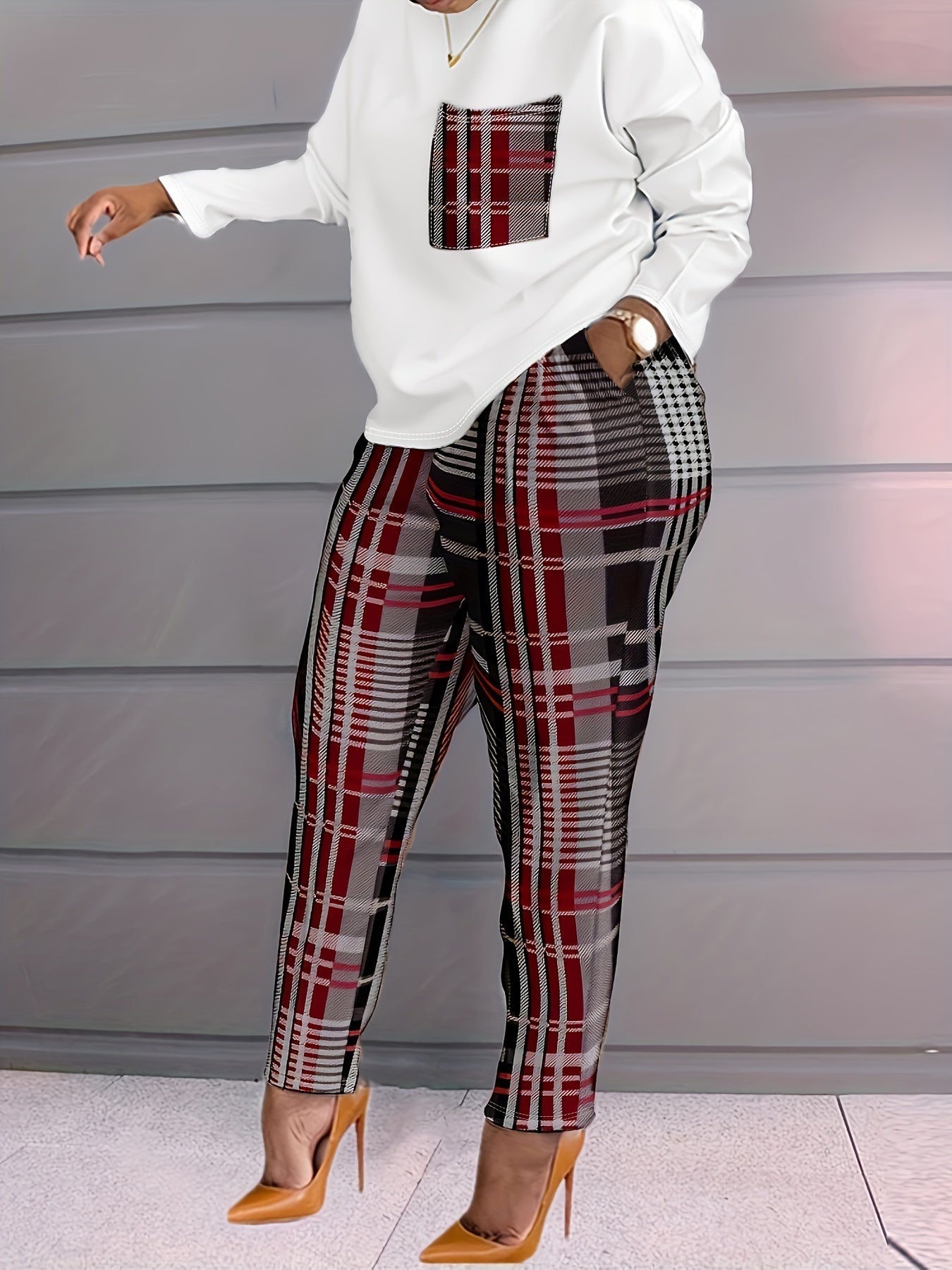 Plus Size Casual Outfits Set, Women's Plus Plaid Print, Long Sleeve Round Neck Top & Pocketed Pants, Outfits Two Piece Set