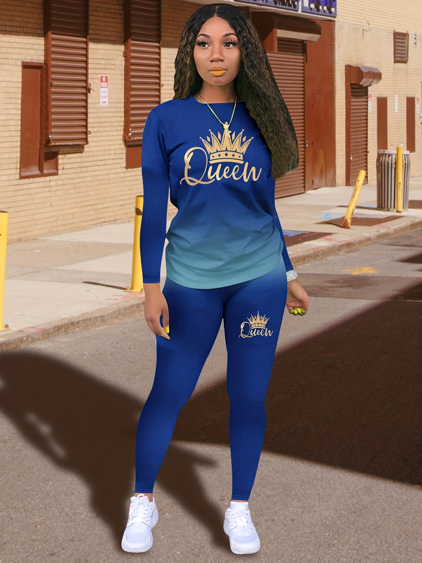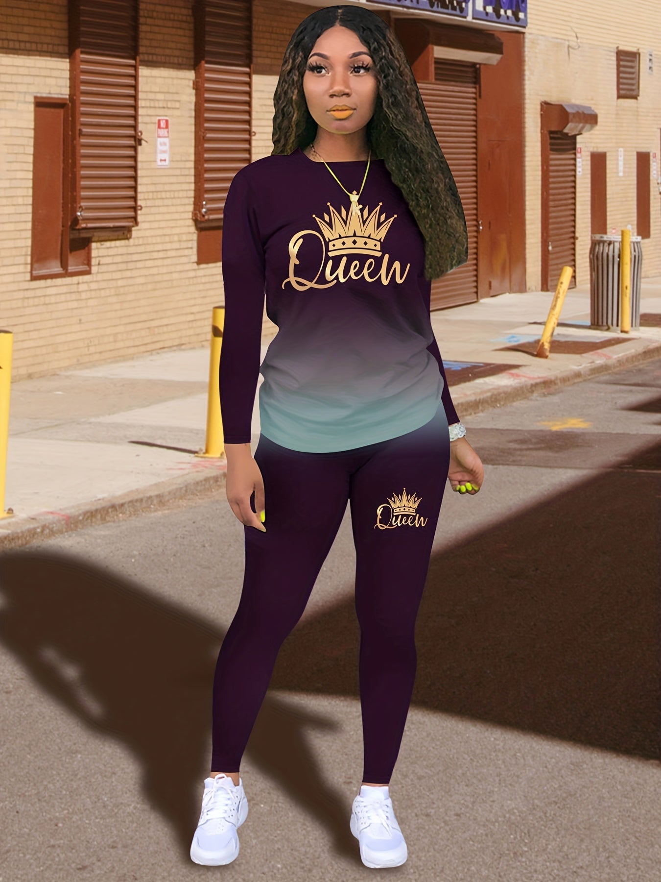 Queen Letter Print Two-piece Set, Crew Neck Long Sleeve Tops & Slim Pants Outfits, Women's Clothing
