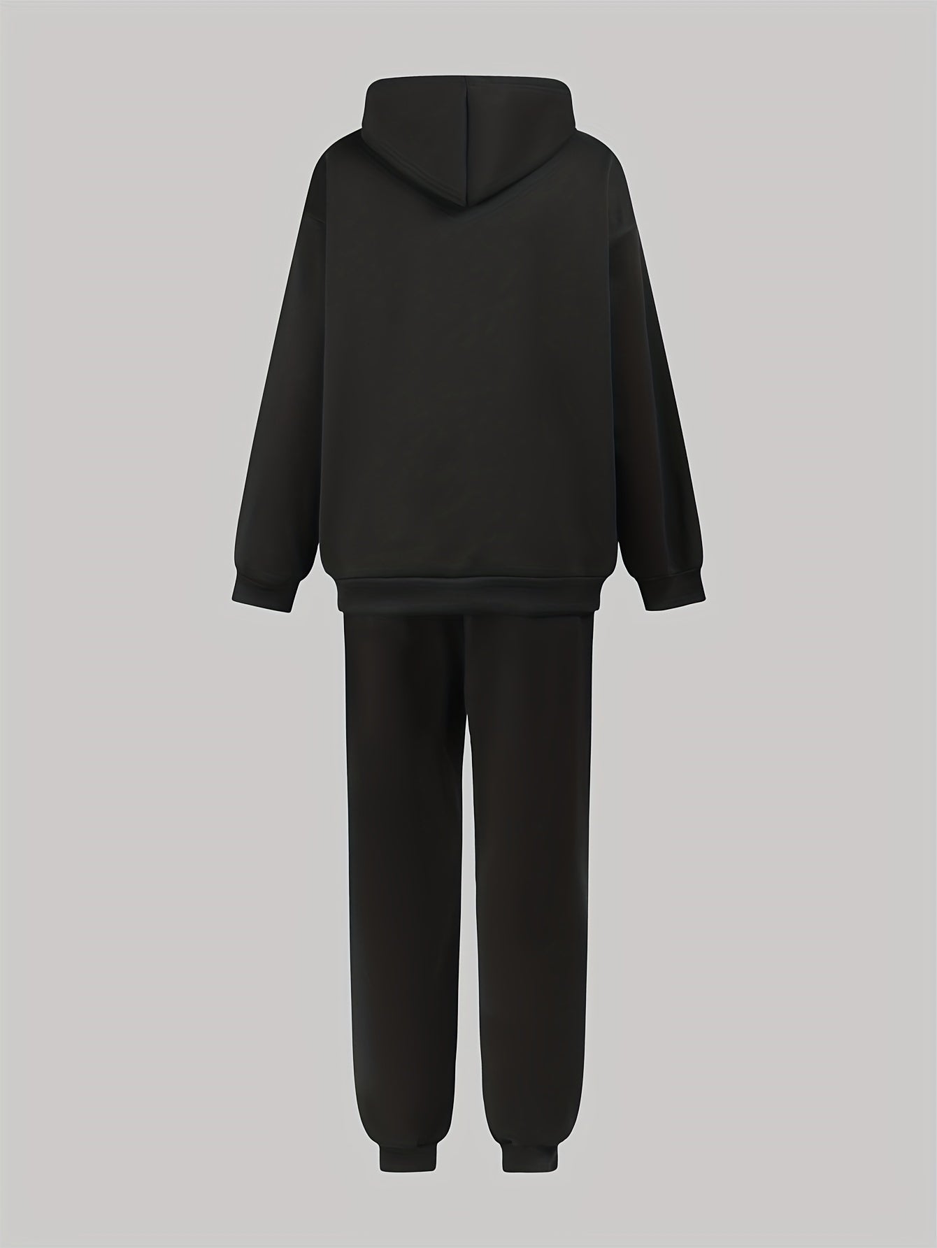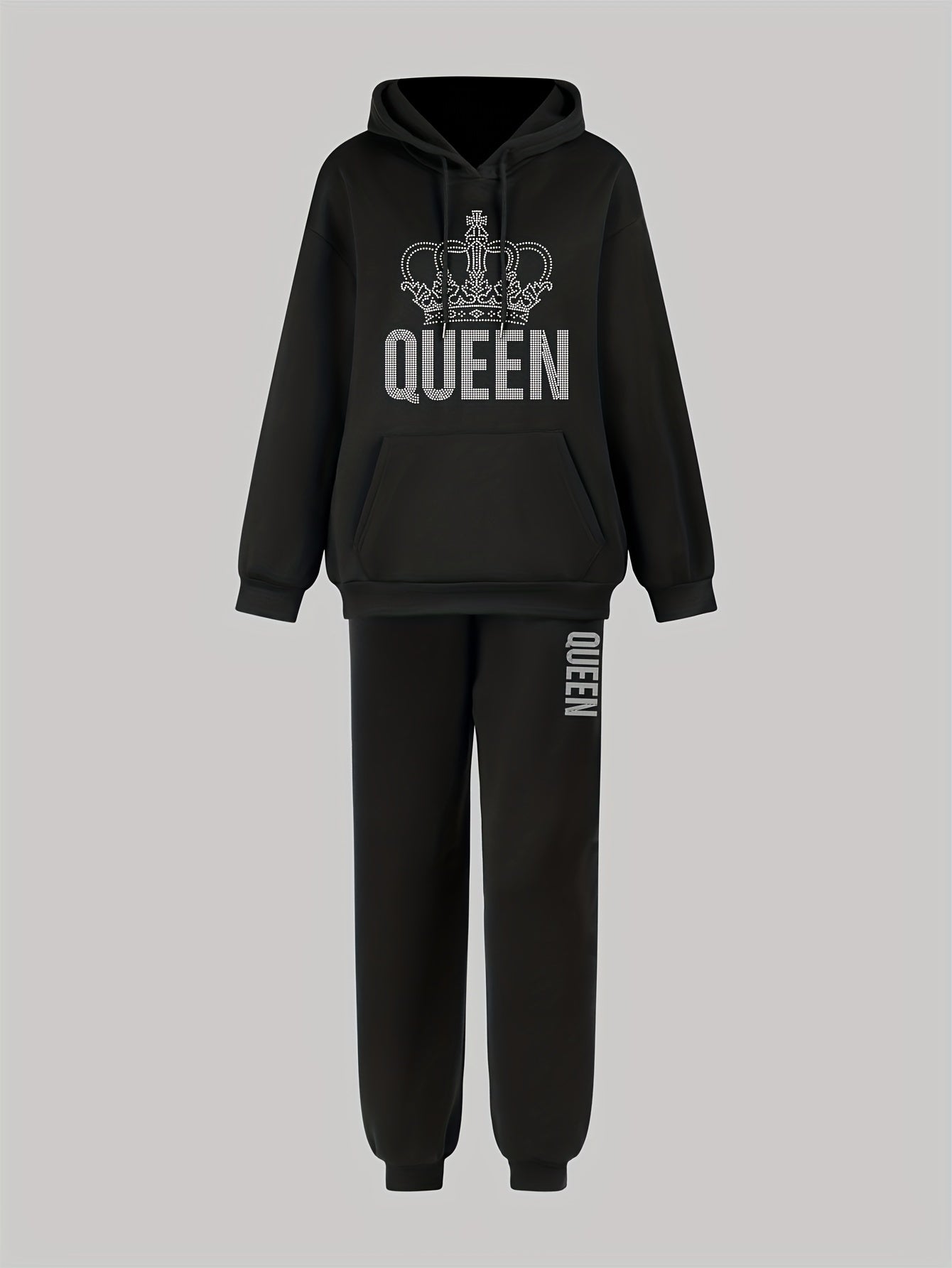 Queen Print Two-piece Set, Casual Long Sleeve Drawstring Hoodie & Jogger Sweatpants Outfits, Women's Clothing