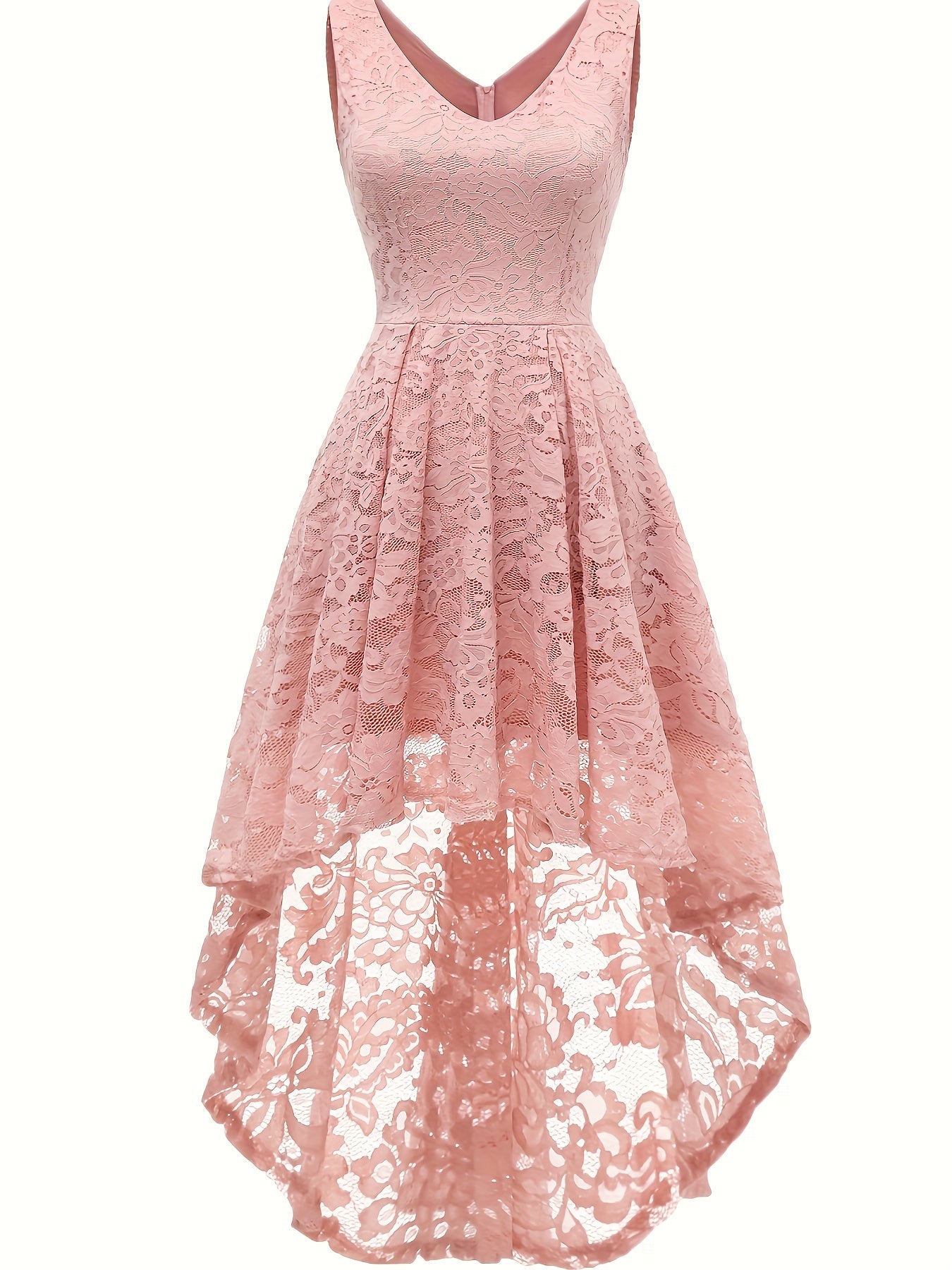 Solid Lace Asymmetrical Hem Dress, Elegant Sleeveless Aline Tank Dress For Wedding Party, Women's Clothing