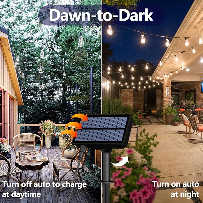 - 【8 Lighting Modes + Remote + Bright】 Create a stunning look for your outdoor space by this solar powered string light. Then, enjoy the comfortable and relaxing atmosphere by 8 lightning modes and remote control under the soft warm white light.
