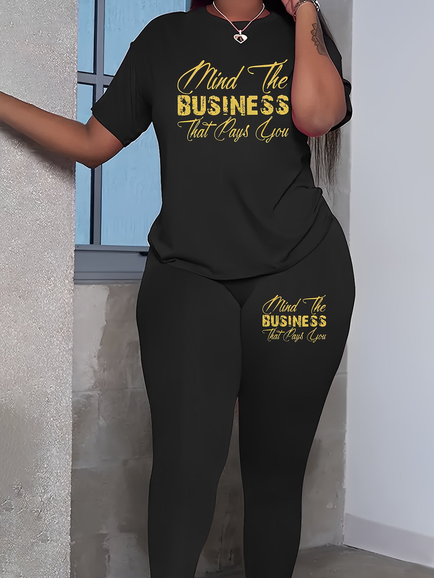 Women's Casual Outfits Set, Plus Size Letter Print, Short Sleeve Round Neck Tee & Leggings, Outfits 2 Piece Set