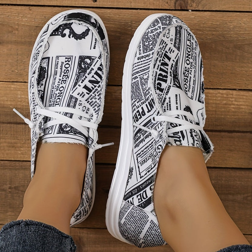 Women's Fashion Canvas Shoes, Newspaper Print Low Top Slip On Loafers, Casual Lightweight Walking Shoes